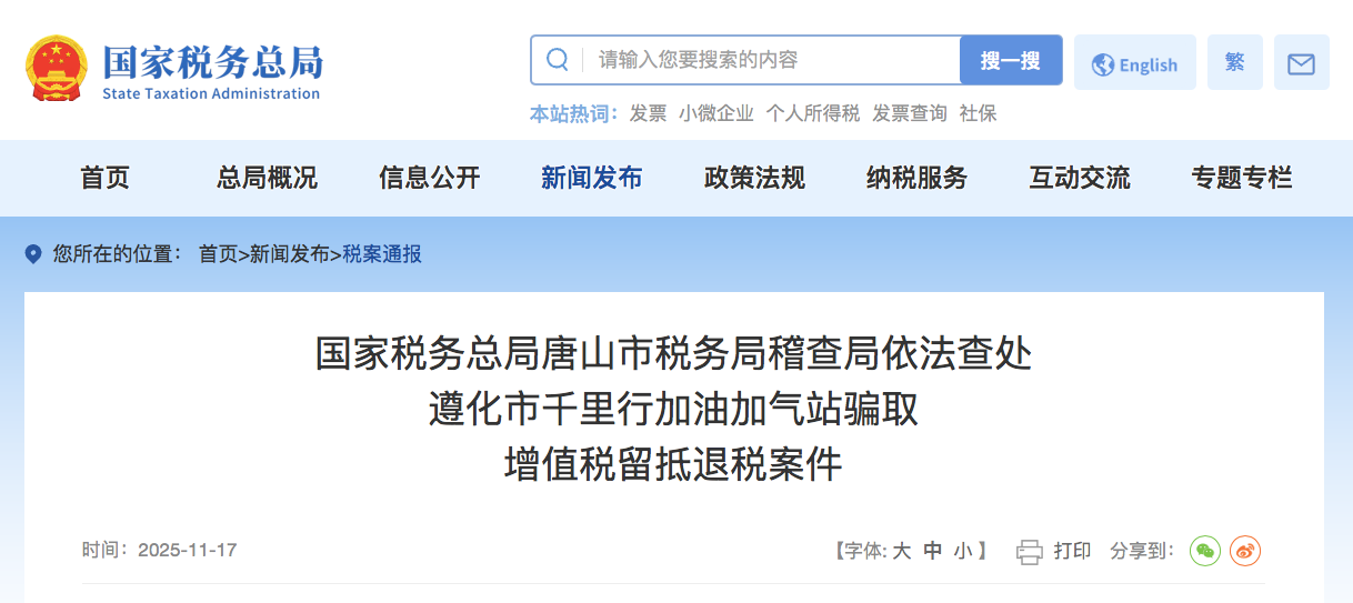 前期,国家税务总局唐山市税务局稽查局依法查处遵化市千里行加油加气站骗取增值税留抵退税案件。