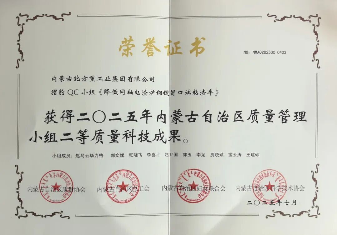 近日,北重集团特钢事业部“猎豹QC小组”凭借《降低同轴电渣炉钢锭冒口端粘渣率》课题,喜获2025年内蒙古自治区质量管理小组二等质量科技成果,以实打实的创新突破,生动诠释了北重集团“质量强企”战略的深刻内涵与实践成效。